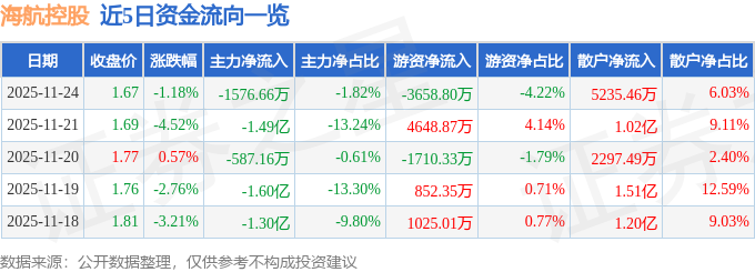 证券之星消息,截至2025年11月24日收盘,海航控股(600221)报收于1.67元,下跌1.18%,换手率1.57%,成交量517.39万手,成交额8.68亿元。