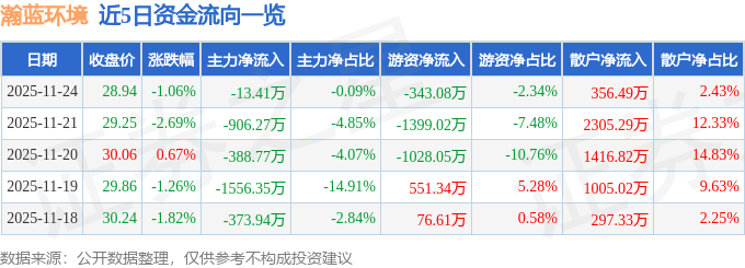 证券之星消息,截至2025年11月24日收盘,瀚蓝环境(600323)报收于28.94元,下跌1.06%,换手率0.62%,成交量5.07万手,成交额1.47亿元。