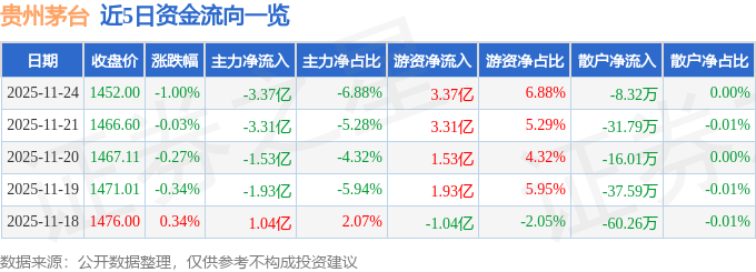 证券之星消息,截至2025年11月24日收盘,贵州茅台(600519)报收于1452.0元,下跌1.0%,换手率0.27%,成交量3.36万手,成交额49.02亿元。
