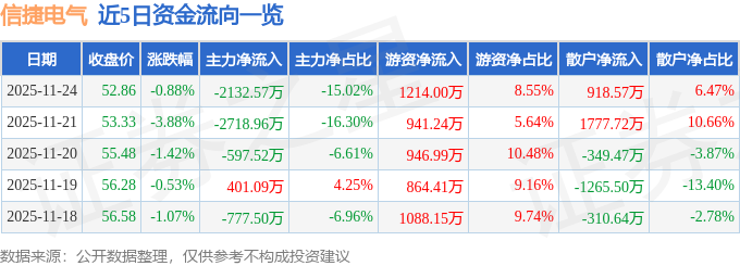 证券之星消息,截至2025年11月24日收盘,信捷电气(603416)报收于52.86元,下跌0.88%,换手率1.92%,成交量2.68万手,成交额1.42亿元。