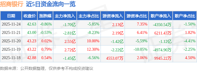 证券之星消息,截至2025年11月24日收盘,招商银行(600036)报收于42.63元,下跌0.86%,换手率0.33%,成交量67.85万手,成交额29.04亿元。