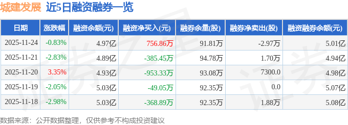 城建发展融资融券信息显示,融资方面,当日融资买入1970.11万元,融资偿还1213.25万元,融资净买入756.86万元。融券方面,融券卖出1800.0股,融券偿还3.15万股,融券余量91.81万股,融券余额437.02万元。融资融券余额5.01亿元。