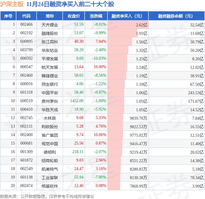 沪深主板融资净买入前三分别为:天齐锂业(002466)融资净买入2.62亿元、融捷股份(002192)融资净买入1.91亿元、张江高科(600895)融资净买入1.56亿元,前20具体见下表: