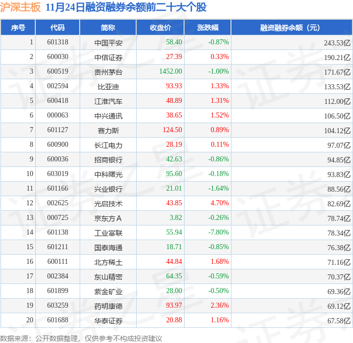 沪深主板融资融券余额前三分别为:中国平安(601318)融资融券余额243.53亿元、中信证券(600030)融资融券余额190.21亿元、贵州茅台(600519)融资融券余额171.67亿元,前20具体见下表: