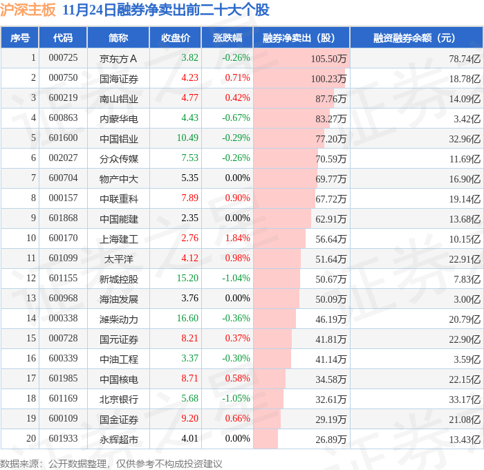 沪深主板融券净卖出前三分别为:京东方A(000725)融券净卖出105.5万股、国海证券(000750)融券净卖出100.23万股、南山铝业(600219)融券净卖出87.76万股,前20具体见下表: