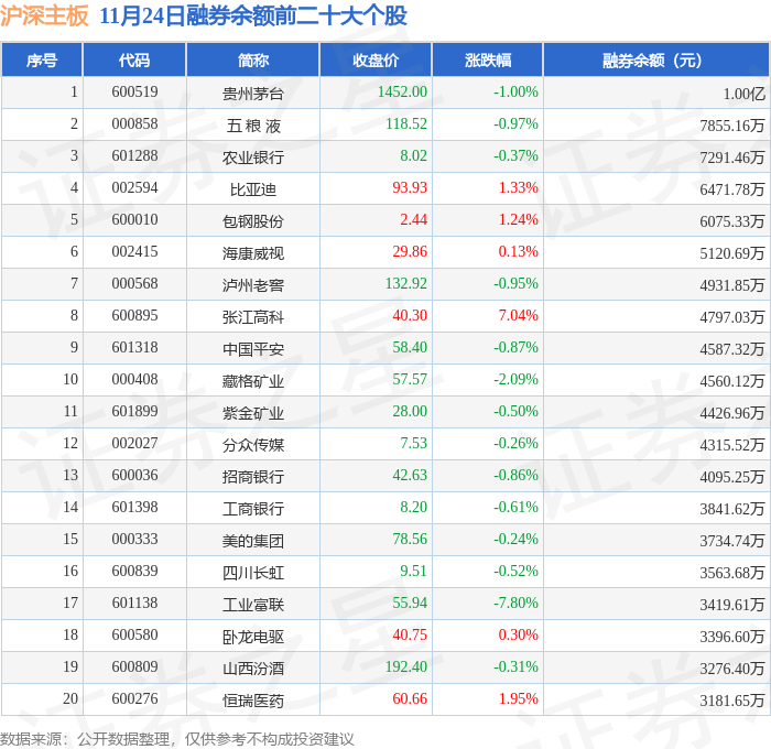 沪深主板融券余额前三分别为:贵州茅台(600519)融券余额1亿元、五 粮 液(000858)融券余额7855.16万元、农业银行(601288)融券余额7291.46万元,前20具体见下表: