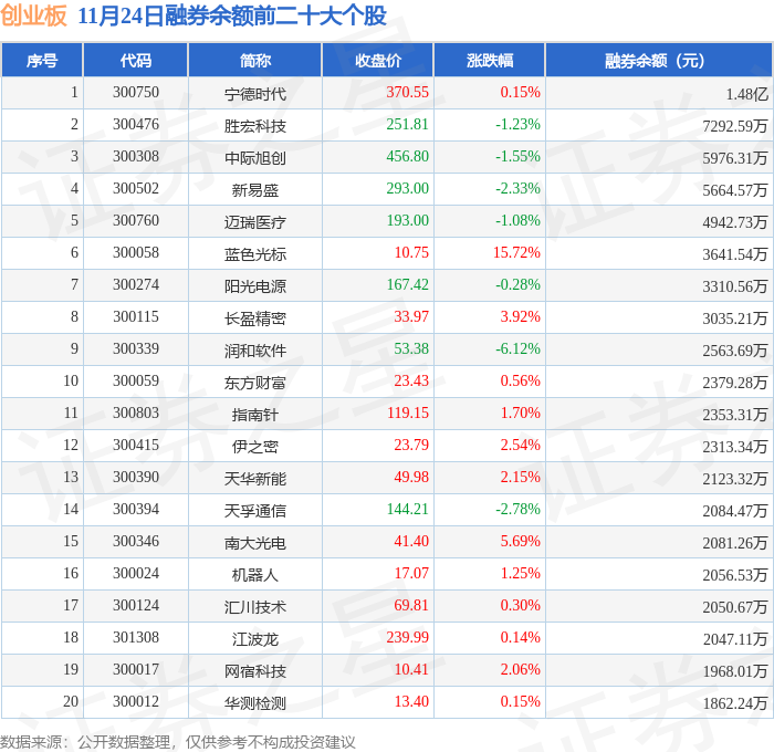 创业板融券余额前三分别为:宁德时代(300750)融券余额1.48亿元、胜宏科技(300476)融券余额7292.59万元、中际旭创(300308)融券余额5976.31万元,前20具体见下表:
