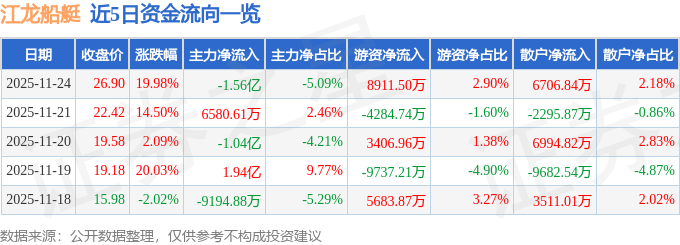 证券之星消息,截至2025年11月24日收盘,江龙船艇(300589)报收于26.9元,上涨19.98%,涨停,换手率55.21%,成交量127.88万手,成交额30.7亿元。