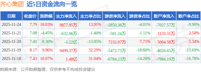 证券之星消息,截至2025年11月24日收盘,齐心集团(002301)报收于7.79元,上涨10.03%,涨停,换手率13.11%,成交量94.12万手,成交额7.1亿元。
