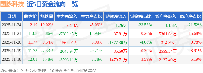 证券之星消息,截至2025年11月24日收盘,国脉科技(002093)报收于12.19元,上涨10.02%,涨停,换手率4.43%,成交量44.66万手,成交额5.36亿元。