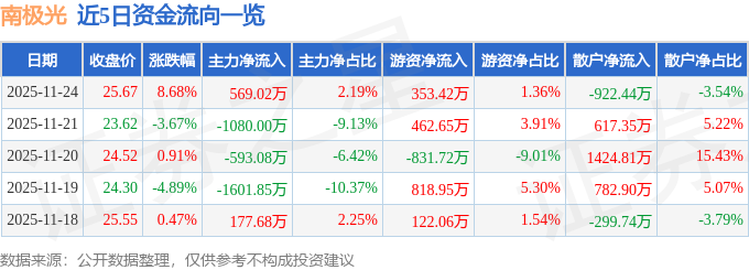 证券之星消息,截至2025年11月24日收盘,南极光(300940)报收于25.67元,上涨8.68%,换手率6.62%,成交量10.43万手,成交额2.6亿元。