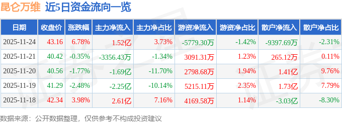 证券之星消息,截至2025年11月24日收盘,昆仑万维(300418)报收于43.16元,上涨6.78%,换手率7.69%,成交量96.44万手,成交额40.72亿元。