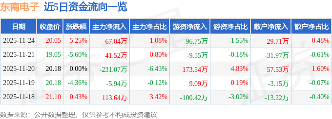 证券之星消息,截至2025年11月24日收盘,东南电子(301359)报收于20.05元,上涨5.25%,换手率4.58%,成交量3.13万手,成交额6227.31万元。