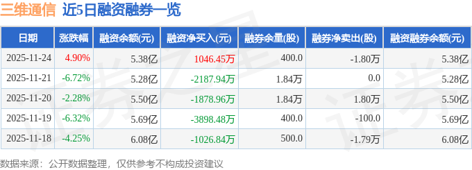 三维通信融资融券信息显示,融资方面,当日融资买入7463.32万元,融资偿还6416.87万元,融资净买入1046.45万元。融券方面,融券卖出0.0股,融券偿还1.8万股,融券余量400.0股,融券余额0.42万元。融资融券余额5.38亿元。