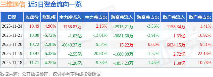 证券之星消息,截至2025年11月24日收盘,三维通信(002115)报收于10.49元,上涨4.9%,换手率10.52%,成交量79.1万手,成交额8.19亿元。