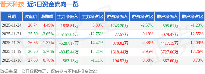 证券之星消息,截至2025年11月24日收盘,普天科技(002544)报收于26.74元,上涨4.49%,换手率2.69%,成交量18.3万手,成交额4.84亿元。