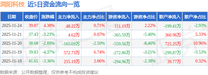 证券之星消息,截至2025年11月24日收盘,润阳科技(300920)报收于39.07元,上涨4.38%,换手率3.19%,成交量1.76万手,成交额6809.27万元。