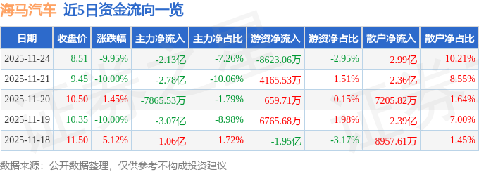 证券之星消息,截至2025年11月24日收盘,海马汽车(000572)报收于8.51元,下跌9.95%,已连续跌停2天,换手率20.07%,成交量329.67万手,成交额29.28亿元。