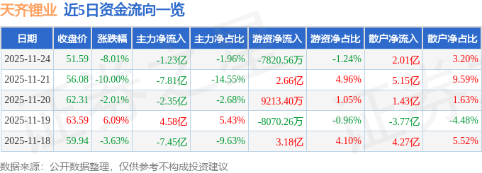 证券之星消息,截至2025年11月24日收盘,天齐锂业(002466)报收于51.59元,下跌8.01%,换手率8.21%,成交量121.14万手,成交额62.93亿元。