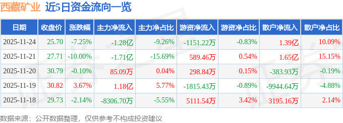 证券之星消息,截至2025年11月24日收盘,西藏矿业(000762)报收于25.7元,下跌7.25%,换手率10.3%,成交量53.65万手,成交额13.81亿元。
