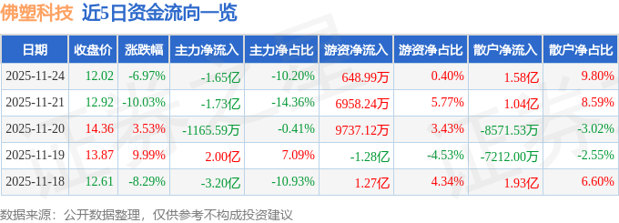 证券之星消息,截至2025年11月24日收盘,佛塑科技(000973)报收于12.02元,下跌6.97%,换手率13.62%,成交量131.77万手,成交额16.17亿元。