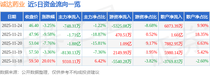 证券之星消息,截至2025年11月24日收盘,诚达药业(301201)报收于46.4元,下跌3.25%,换手率11.96%,成交量12.98万手,成交额6.13亿元。