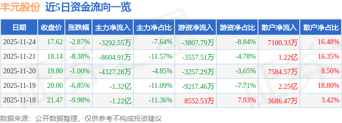 证券之星消息,截至2025年11月24日收盘,丰元股份(002805)报收于17.62元,下跌2.87%,换手率8.68%,成交量24.17万手,成交额4.31亿元。