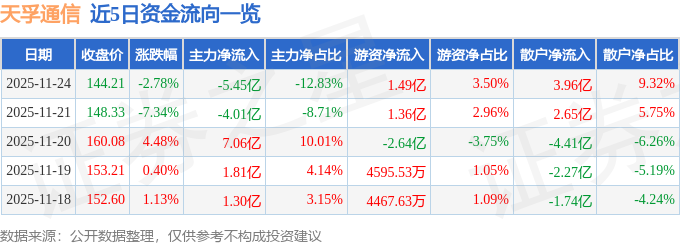 证券之星消息,截至2025年11月24日收盘,天孚通信(300394)报收于144.21元,下跌2.78%,换手率3.77%,成交量29.26万手,成交额42.5亿元。