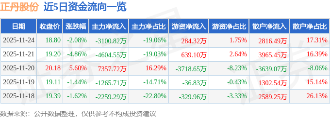 证券之星消息,截至2025年11月24日收盘,正丹股份(300641)报收于18.8元,下跌2.08%,换手率1.63%,成交量8.68万手,成交额1.63亿元。