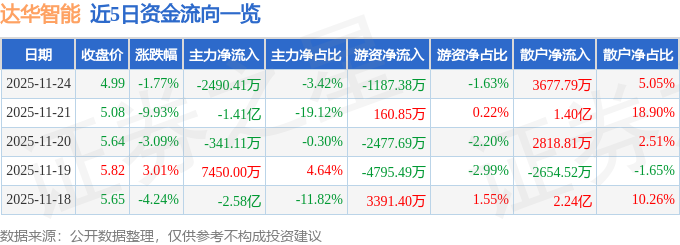 证券之星消息,截至2025年11月24日收盘,达华智能(002512)报收于4.99元,下跌1.77%,换手率13.52%,成交量147.95万手,成交额7.28亿元。