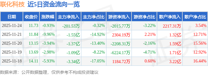 证券之星消息,截至2025年11月24日收盘,联化科技(002250)报收于11.73元,下跌0.93%,换手率5.96%,成交量53.31万手,成交额6.27亿元。