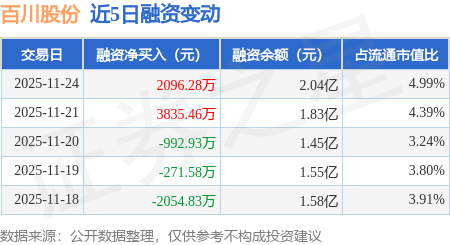 证券之星消息,11月24日,百川股份(002455)融资买入7153.13万元,融资偿还5056.85万元,融资净买入2096.28万元,融资余额2.04亿元。