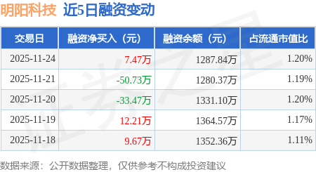 证券之星消息,11月24日,明阳科技(920663)融资买入31.19万元,融资偿还23.72万元,融资净买入7.47万元,融资余额1287.84万元,近20个交易日中有12个交易日出现融资净买入。