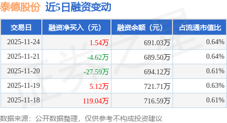 证券之星消息,11月24日,泰德股份(920378)融资买入97.24万元,融资偿还95.7万元,融资净买入1.54万元,融资余额691.03万元,近20个交易日中有12个交易日出现融资净买入。