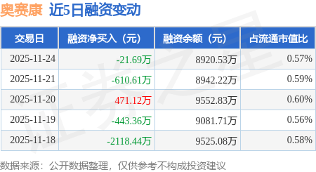 证券之星消息,11月24日,奥赛康(002755)融资买入1411.72万元,融资偿还1433.41万元,融资净卖出21.69万元,融资余额8920.53万元,近20个交易日中有15个交易日出现融资净买入。