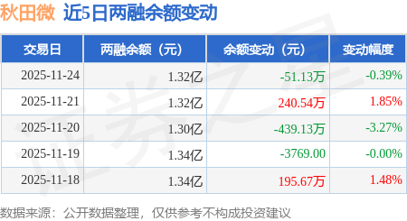 证券之星消息,11月24日,秋田微(300939)融资买入402.14万元,融资偿还453.26万元,融资净卖出51.13万元,融资余额1.32亿元。