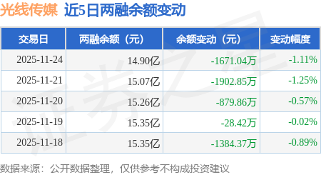 证券之星消息,11月24日,光线传媒(300251)融资买入5226.61万元,融资偿还6813.03万元,融资净卖出1586.41万元,融资余额14.73亿元。
