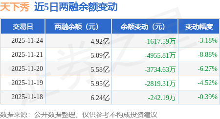 证券之星消息,11月24日,天下秀(600556)融资买入1.39亿元,融资偿还1.55亿元,融资净卖出1604.17万元,融资余额4.91亿元。