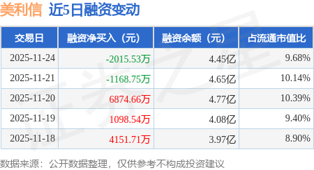 证券之星消息,11月24日,美利信(301307)融资买入5510.42万元,融资偿还7525.95万元,融资净卖出2015.53万元,融资余额4.45亿元,近20个交易日中有12个交易日出现融资净买入。