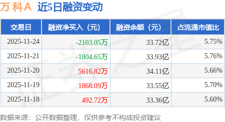 证券之星消息,11月24日,万 科A(000002)融资买入5297.1万元,融资偿还7400.15万元,融资净卖出2103.05万元,融资余额33.72亿元。