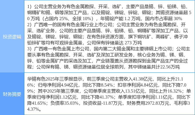 该股为有色 · 锡,有色 · 锑,有色 · 锌概念热股,当日有色 · 锡概念上涨5.67%,有色 · 锑概念上涨4.01%,有色 · 锌概念上涨4.0%。