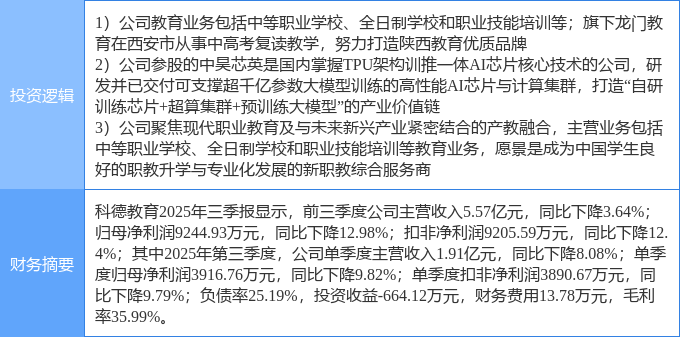 该股为AI算力芯片,职业教育,教育概念热股,当日AI算力芯片概念上涨2.21%,职业教育概念上涨2.0%,教育概念上涨1.66%。