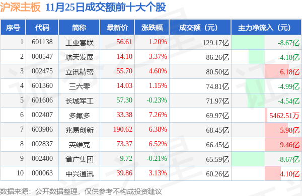 当日沪深主板成交额前10大个股中8只个股收涨,平均涨幅4.2%,其中工业富联(601138)以成交额129.17亿元排第一。从主力资金流入看,成交额前10大个股中有5只个股呈现主力资金净流入。