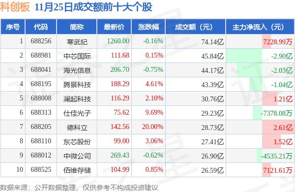 当日科创板成交额前10大个股中7只个股收涨,平均涨幅5.78%,其中寒武纪(688256)以成交额74.14亿元排第一。从主力资金流入看,成交额前10大个股中有5只个股呈现主力资金净流入。