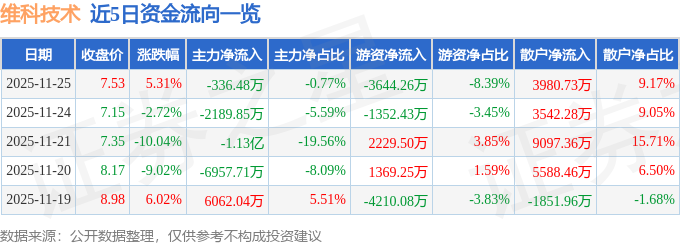 证券之星消息,截至2025年11月25日收盘,维科技术(600152)报收于7.53元,上涨5.31%,换手率10.91%,成交量57.72万手,成交额4.34亿元。