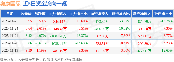 证券之星消息,截至2025年11月25日收盘,奥康国际(603001)报收于8.95元,上涨3.59%,换手率1.28%,成交量5.12万手,成交额4537.7万元。