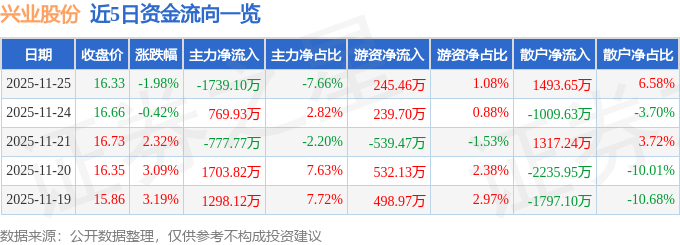 证券之星消息,截至2025年11月25日收盘,兴业股份(603928)报收于16.33元,下跌1.98%,换手率5.31%,成交量13.91万手,成交额2.27亿元。
