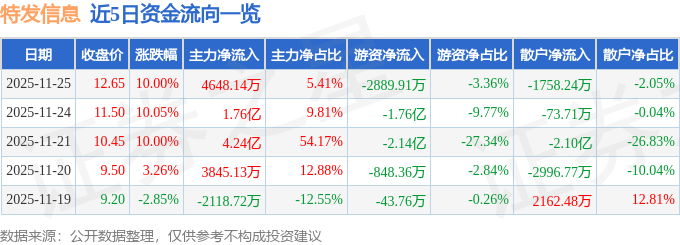 证券之星消息,截至2025年11月25日收盘,特发信息(000070)报收于12.65元,上涨10.0%,已连续涨停3天,换手率7.78%,成交量69.12万手,成交额8.6亿元。