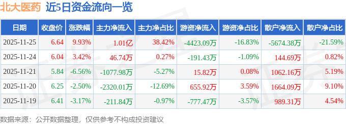 证券之星消息,截至2025年11月25日收盘,北大医药(000788)报收于6.64元,上涨9.93%,涨停,换手率6.79%,成交量40.49万手,成交额2.63亿元。