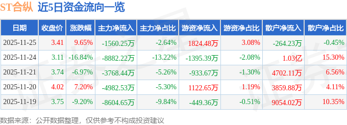 证券之星消息,截至2025年11月25日收盘,ST合纵(300477)报收于3.41元,上涨9.65%,换手率18.24%,成交量180.77万手,成交额5.92亿元。